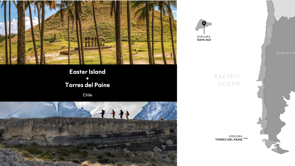 Connect with history and culture, from the desert landscapes of Atacama to the sacred sites of Peru, all while taking in Patagonia’s dramatic scenery. - Full Immersion: Torres del Paine + Easter Island + Atacama + Sacred Valley / Machu Picchu (three destinations, 25% discount)